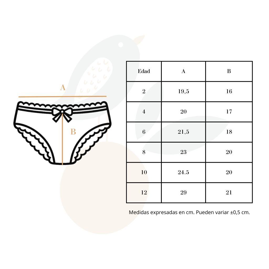Elegir el talle correcto es clave para garantizar comodidad y buen calce. En Naranjo Básicos recomendamos guiarte principalmente por la edad y el contorno corporal de la nena, ya que cada cuerpo es único.